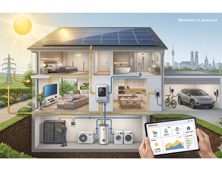 Ein Home Energy Management System verteilt den erzeugten Solarstrom intelligent im Haushalt und erhöht so Eigenverbrauch, Wirtschaftlichkeit und Unabhängigkeit vom Netz.